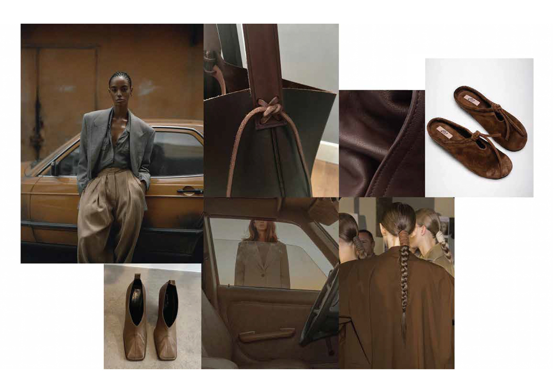 Structured softness defines this story. Clean silhouettes are paired with raw leather ties and sculpted heels, creating tension between control and sensuality. A muted, earthy palette allows proportion and texture to lead. The collection feels grounded, personal, and quietly confident.